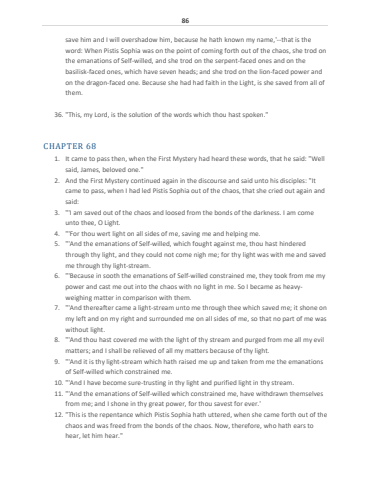 86save him and I will overshadow him, because he hath known my name,'--that is the word: When Pistis Sophia was on the point of coming forth out of the chaos, she trod on the emanations of Self-willed, and she trod on the serpent-faced ones and on the basilisk-faced ones, which have seven heads; and she trod on the lion-faced power and on the dragon-faced one. Because she had had faith in the Light, is she saved from all of them.36. \CHAPTER 681. It came to pass then, when the First Mystery had heard these words, that he said: \said, James, beloved one.\2. And the First Mystery continued again in the discourse and said unto his disciples: \came to pass, when I had led Pistis Sophia out of the chaos, that she cried out again and said:3. %unto thee, O Light.4. \5. \through thy light, and they could not come nigh me; for thy light was with me and saved me through thy light-stream.6. \power and cast me out into the chaos with no light in me. So I became as heavyweighing matter in comparison with them.7. \my left and on my right and surrounded me on all sides of me, so that no part of me was without light.8. \matters; and I shall be relieved of all my matters because of thy light.9. \of Self-willed which constrained me.10. \11. \from me; and I shone in thy great power, for thou savest for ever.'12. \chaos and was freed from the bonds of the chaos. Now, therefore, who hath ears to hear, let him hear.\