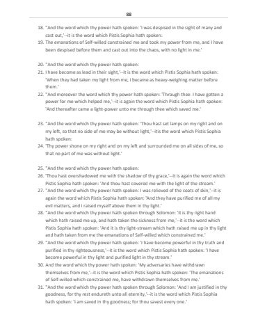 8818. \cast out,'--it is the word which Pistis Sophia hath spoken:19. The emanations of Self-willed constrained me and took my power from me, and I have been despised before them and cast out into the chaos, with no light in me.'20. \21. I have become as lead in their sight,'--it is the word which Pistis Sophia hath spoken: 'When they had taken my light from me, I became as heavy-weighing matter before them.'22. \power for me which helped me,'--it is again the word which Pistis Sophia hath spoken: 'And thereafter came a light-power unto me through thee which saved me.'23. \my left, so that no side of me may be without light,'--itis the word which Pistis Sophia hath spoken:24. 'Thy power shone on my right and on my left and surrounded me on all sides of me, so that no part of me was without light.'25. \26. 'Thou hast overshadowed me with the shadow of thy grace,'--it is again the word which Pistis Sophia hath spoken: 'And thou hast covered me with the light of the stream.'27. \again the word which Pistis Sophia hath spoken: 'And they have purified me of all my evil matters, and I raised myself above them in thy light.'28. \which hath raised me up, and hath taken the sickness from me,'--it is the word which Pistis Sophia hath spoken: 'And it is thy light-stream which hath raised me up in thy light and hath taken from me the emanations of Self-willed which constrained me.'29. \purified in thy righteousness,'--it is the word which Pistis Sophia hath spoken: 'I have become powerful in thy light and purified light in thy stream.'30. And the word which thy power hath spoken: 'My adversaries have withdrawn themselves from me,'--it is the word which Pistis Sophia hath spoken: 'The emanations of Self-willed which constrained me, have withdrawn themselves from me.'31. \goodness, for thy rest endureth unto all eternity,'--it is the word which Pistis Sophia hath spoken: 'I am saved in thy goodness; for thou savest every one.'