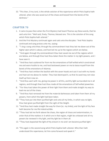8932. %uttered, when she was saved out of the chaos and loosed from the bonds of the darkness.\CHAPTER 701. It came to pass then when the First Mystery had heard Thomas say these words, that he said unto him: \which Pistis Sophia hath uttered.\2. And the First Mystery continued again and said unto the disciples: \continued and sang praises unto me, saying:3. \higher %u00e6on which is above, and hast led me up to the regions which are below.4. \are below, and through thee hast thou taken there the matter in my light-powers, and I have seen it.5. \me and were hostile to me, and hast bestowed power on me to loose myself from the bonds of the emanations of Adamas.6. \and hast set me above its matter. Thou hast destroyed it, so that its seed may not raise itself up from now on.7. \regions, and through thee hast thou made all the emanations of Self-willed powerless.8. \lead me out of the chaos.9. \powers, from which the light had been taken.10. \thou hast given purified light from the Light of the Height.11. \hath become for me life indestructible.12. \order that all the matters in it which are in that region, might be unloosed and all my powers be renewed in thy light, and thy light be in them all.13. \14. %understood this repentance, let him come forward and speak it.\