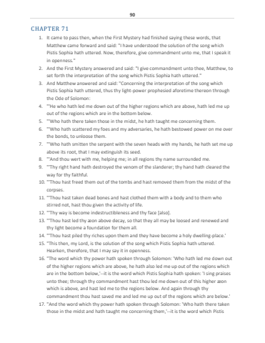 90CHAPTER 711. It came to pass then, when the First Mystery had finished saying these words, that Matthew came forward and said: \Pistis Sophia hath uttered. Now, therefore, give commandment unto me, that I speak it in openness.\2. And the First Mystery answered and said: \set forth the interpretation of the song which Pistis Sophia hath uttered.\3. And Matthew answered and said: \Pistis Sophia hath uttered, thus thy light-power prophesied aforetime thereon through the Ode of Solomon:4. \out of the regions which are in the bottom below.5. \6. \the bonds, to unloose them.7. \above its root, that I may extinguish its seed.8. \9. \way for thy faithful.10. \corpses.11. \stirred not, hast thou given the activity of life.12. \13. \thy light become a foundation for them all.14. \15. \Hearken, therefore, that I may say it in openness.16. \of the higher regions which are above, he hath also led me up out of the regions which are in the bottom below,'--it is the word which Pistis Sophia hath spoken: 'I sing praises unto thee; through thy commandment hast thou led me down out of this higher %u00e6on which is above, and hast led me to the regions below. And again through thy commandment thou hast saved me and led me up out of the regions which are below.'17. \those in the midst and hath taught me concerning them,'--it is the word which Pistis
