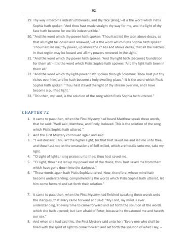 9229. Thy way is become indestructibleness, and thy face [also],'--it is the word which Pistis Sophia hath spoken: 'And thou hast made straight thy way for me, and the light of thy face hath become for me life indestructible.'30. \that all might be loosed and renewed,'--it is the word which Pistis Sophia hath spoken: 'Thou hast led me, thy power, up above the chaos and above decay, that all the matters in that region may be loosed and all my powers renewed in the Light.'31. \for them all,'--it is the word which Pistis Sophia hath spoken: 'And thy light hath been in them all.'32. \riches over him, and he hath become a holy dwelling-place,'--it is the word which Pistis Sophia hath spoken: 'Thou hast stayed the light of thy stream over me, and I have become a purified light.'33. \CHAPTER 721. It came to pass then, when the First Mystery had heard Matthew speak these words, that he said: \which Pistis Sophia hath uttered.\2. And the First Mystery continued again and said:3. \and thou hast not let the emanations of Self-willed, which are hostile unto me, take my light.4. \5. \which have gone down into the darkness.'6. \become understanding, comprehending the words which Pistis Sophia hath uttered, let him come forward and set forth their solution.\7. It came to pass then, when the First Mystery had finished speaking these words unto the disciples, that Mary came forward and said: %understanding, at every time to come forward and set forth the solution of the words which she hath uttered; but I am afraid of Peter, because he threatened me and hateth our sex.\8. And when she had said this, the First Mystery said unto her: \filled with the spirit of light to come forward and set forth the solution of what I say, --
