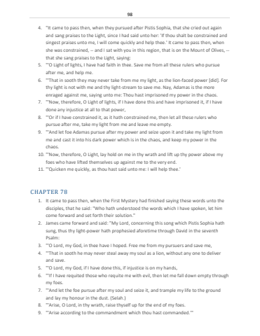 984. \and sang praises to the Light, since I had said unto her: 'If thou shalt be constrained and singest praises unto me, I will come quickly and help thee.' It came to pass then, when she was constrained, -- and I sat with you in this region, that is on the Mount of Olives, --that she sang praises to the Light, saying:5. \after me, and help me.6. \thy light is not with me and thy light-stream to save me. Nay, Adamas is the more enraged against me, saying unto me: Thou hast imprisoned my power in the chaos.7. \done any injustice at all to that power,8. \pursue after me, take my light from me and leave me empty.9. \me and cast it into his dark power which is in the chaos, and keep my power in the chaos.10. \foes who have lifted themselves up against me to the very end.11. \CHAPTER 781. It came to pass then, when the First Mystery had finished saying these words unto the disciples, that he said: \come forward and set forth their solution.\2. James came forward and said: \sung, thus thy light-power hath prophesied aforetime through David in the seventh Psalm:3. \4. \and save.5. \6. \my foes.7. \and lay my honour in the dust. (Selah.)8. \9. \