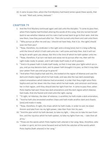 9910. It came to pass then, when the First Mystery had heard James speak these words, that he said: \CHAPTER 791. And the First Mystery continued again and said unto the disciples: \when Pistis Sophia had finished uttering the words of this song, that she turned herself back to see whether Adamas and his rulers had turned back to go to their %u00e6on. And she saw them, how they pursued after her. Then she turned unto them and said unto them:2. \save me from you?3. %until the time of which it hath said unto me: I will come and help thee. And it will not bring its wrath upon you always. But this is the time of which he hath spoken unto me.4. \Light make ready its power, and it will make itself ready in all its powers.5. \you, and ye may become dark; and its power hath brought it to pass, so that it may take your power from you and ye go to ground.'6. \dark and chaotic region which he had made, and saw also the two dark exceedingly violent emanations which Adamas had emanated, in order that they might seize Pistis Sophia and cast her down into the chaos which he had made, and constrain and harass her in that region, until they should take her light from her. It came to pass then, when Pistis Sophia had seen those two dark emanations and the dark region which Adamas had made, that she feared and cried unto the Light, saying:7. \8. \[one] and made it ready.9. \therein and take from me my light-power, take then from him his own.10. \him; and the injustice which he hath spoken, to take my lights from me, -- take then all of his.'11. \is sober in spirit, let him come forward and set forth the solution of the words which Pistis Sophia [hath uttered] in her song.\