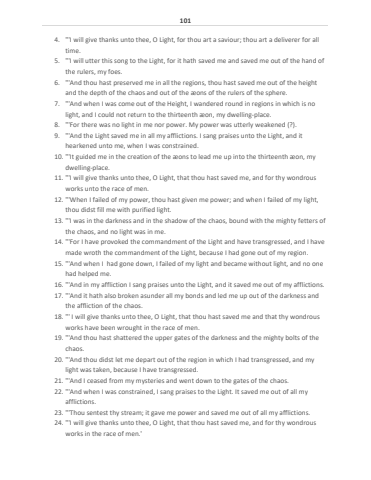 1014. \time.5. \the rulers, my foes.6. \and the depth of the chaos and out of the %u00e6ons of the rulers of the sphere.7. \light, and I could not return to the thirteenth %u00e6on, my dwelling-place.8. \9. \hearkened unto me, when I was constrained.10. \dwelling-place.11. \works unto the race of men.12. \thou didst fill me with purified light.13. \the chaos, and no light was in me.14. \made wroth the commandment of the Light, because I had gone out of my region.15. \had helped me.16. \17. \the affliction of the chaos.18. \works have been wrought in the race of men.19. \chaos.20. \light was taken, because I have transgressed.21. \22. \afflictions.23. \24. \works in the race of men.'