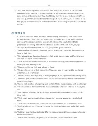 10225. \twenty invisibles, desiring that they should know all the wondrous works which I had done for her, and desiring that they should know that I have gone to the world of men and have given them the mysteries of the Height. Now, therefore, who is exalted in his thought, let him come forward and say the solution of the song which Pistis Sophia hath uttered.\CHAPTER 821. It came to pass then, when Jesus had finished saying these words, that Philip came forward and said: \solution of the song which Pistis Sophia hath uttered. The prophet David hath prophesied concerning it aforetime in the one-hundred-and-sixth Psalm, saying:2. \3. \hand of their foes.4. \and from the north and from the sea.5. \the city of their dwelling-place.6. \7. %unto them in their affliction.8. \9. \the children of men.10. \11. \iron.12. \Most High.13. \them.14. \15. \asunder.16. \the children of men.17. \