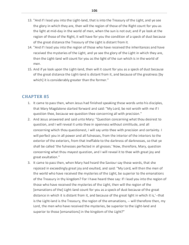10613. \the glory in which they are, then will the region of those of the Right count for you as the light at mid-day in the world of men, when the sun is not out; and if ye look at the region of those of the Right, it will have for you the condition of a speck of dust because of the great distance the Treasury of the Light is distant from it.14. \received the mysteries of the Light, and ye see the glory of the Light in which they are, then the Light-land will count for you as the light of the sun which is in the world of men. 15. And if ye look upon the Light-land, then will it count for you as a speck of dust because of the great distance the Light-land is distant from it, and because of the greatness [by which] it is considerably greater than the former.\CHAPTER 851. It came to pass then, when Jesus had finished speaking these words unto his disciples, that Mary Magdalene started forward and said: \question thee, because we question thee concerning all with precision.\2. And Jesus answered and said unto Mary: \question, and I will reveal it unto thee in openness without similitude, and all concerning which thou questionest, I will say unto thee with precision and certainty. I will perfect you in all power and all fulnesses, from the interior of the interiors to the exterior of the exteriors, from that Ineffable to the darkness of darknesses, so that ye shall be called 'the fulnesses perfected in all gnoses.' Now, therefore, Mary, question concerning what thou mayest question, and I will reveal it to thee with great joy and great exultation.\3. It came to pass then, when Mary had heard the Saviour say these words, that she rejoiced in exceedingly great joy and exulted, and said: \the world who have received the mysteries of the Light, be superior to the emanations of the Treasury in thy kingdom? For I have heard thee say: If I lead you into the region of those who have received the mysteries of the Light, then will the region of the [emanations of the] Light-land count for you as a speck of dust because of the great distance in which it is distant from it, and because of the great light in which it is,'--that is the Light-land is the Treasury, the region of the emanations, -- will therefore then, my Lord, the men who have received the mysteries, be superior to the Light-land and superior to those [emanations] in the kingdom of the Light?\