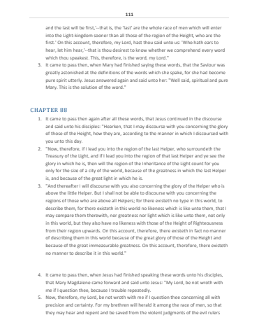 111and the last will be first,'--that is, the 'last' are the whole race of men which will enter into the Light-kingdom sooner than all those of the region of the Height, who are the first.' On this account, therefore, my Lord, hast thou said unto us: 'Who hath ears to hear, let him hear,'--that is thou desirest to know whether we comprehend every word which thou speakest. This, therefore, is the word, my Lord.\3. It came to pass then, when Mary had finished saying these words, that the Saviour was greatly astonished at the definitions of the words which she spake, for she had become pure spirit utterly. Jesus answered again and said unto her: \Mary. This is the solution of the word.\CHAPTER 881. It came to pass then again after all these words, that Jesus continued in the discourse and said unto his disciples: \of those of the Height, how they are, according to the manner in which I discoursed with you unto this day.2. \Treasury of the Light, and if I lead you into the region of that last Helper and ye see the glory in which he is, then will the region of the Inheritance of the Light count for you only for the size of a city of the world, because of the greatness in which the last Helper is, and because of the great light in which he is.3. \above the little Helper. But I shall not be able to discourse with you concerning the regions of those who are above all Helpers; for there existeth no type in this world, to describe them, for there existeth in this world no likeness which is like unto them, that I may compare them therewith, nor greatness nor light which is like unto them, not only in this world, but they also have no likeness with those of the Height of Righteousness from their region upwards. On this account, therefore, there existeth in fact no manner of describing them in this world because of the great glory of those of the Height and because of the great immeasurable greatness. On this account, therefore, there existeth no manner to describe it in this world.\4. It came to pass then, when Jesus had finished speaking these words unto his disciples, that Mary Magdalene came forward and said unto Jesus: \me if I question thee, because I trouble repeatedly. 5. Now, therefore, my Lord, be not wroth with me if I question thee concerning all with precision and certainty. For my brethren will herald it among the race of men, so that they may hear and repent and be saved from the violent judgments of the evil rulers