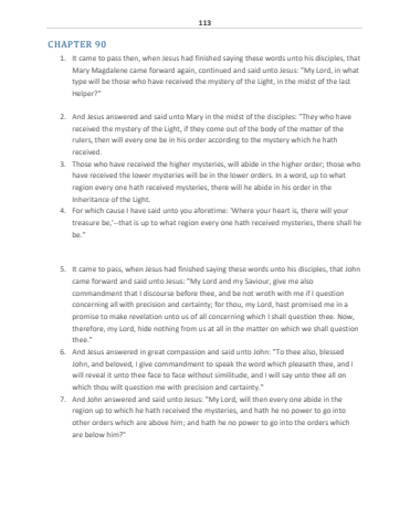113CHAPTER 901. It came to pass then, when Jesus had finished saying these words unto his disciples, that Mary Magdalene came forward again, continued and said unto Jesus: \type will be those who have received the mystery of the Light, in the midst of the last Helper?\2. And Jesus answered and said unto Mary in the midst of the disciples: \received the mystery of the Light, if they come out of the body of the matter of the rulers, then will every one be in his order according to the mystery which he hath received. 3. Those who have received the higher mysteries, will abide in the higher order; those who have received the lower mysteries will be in the lower orders. In a word, up to what region every one hath received mysteries, there will he abide in his order in the Inheritance of the Light. 4. For which cause I have said unto you aforetime: 'Where your heart is, there will your treasure be,'--that is up to what region every one hath received mysteries, there shall he be.\5. It came to pass, when Jesus had finished saying these words unto his disciples, that John came forward and said unto Jesus: \commandment that I discourse before thee, and be not wroth with me if I question concerning all with precision and certainty; for thou, my Lord, hast promised me in a promise to make revelation unto us of all concerning which I shall question thee. Now, therefore, my Lord, hide nothing from us at all in the matter on which we shall question thee.\6. And Jesus answered in great compassion and said unto John: \John, and beloved, I give commandment to speak the word which pleaseth thee, and I will reveal it unto thee face to face without similitude, and I will say unto thee all on which thou wilt question me with precision and certainty.\7. And John answered and said unto Jesus: \region up to which he hath received the mysteries, and hath he no power to go into other orders which are above him; and hath he no power to go into the orders which are below him?\