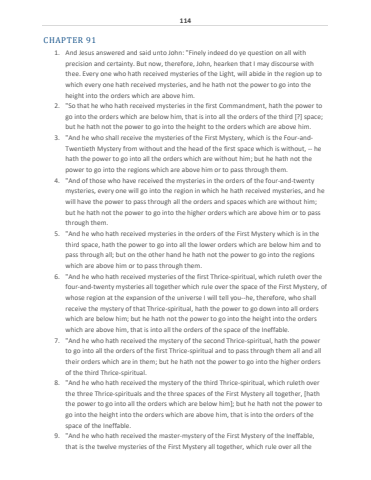 114CHAPTER 911. And Jesus answered and said unto John: \precision and certainty. But now, therefore, John, hearken that I may discourse with thee. Every one who hath received mysteries of the Light, will abide in the region up to which every one hath received mysteries, and he hath not the power to go into the height into the orders which are above him.2. \go into the orders which are below him, that is into all the orders of the third [?] space; but he hath not the power to go into the height to the orders which are above him.3. \Twentieth Mystery from without and the head of the first space which is without, -- he hath the power to go into all the orders which are without him; but he hath not the power to go into the regions which are above him or to pass through them.4. \mysteries, every one will go into the region in which he hath received mysteries, and he will have the power to pass through all the orders and spaces which are without him; but he hath not the power to go into the higher orders which are above him or to pass through them.5. \third space, hath the power to go into all the lower orders which are below him and to pass through all; but on the other hand he hath not the power to go into the regions which are above him or to pass through them.6. \four-and-twenty mysteries all together which rule over the space of the First Mystery, of whose region at the expansion of the universe I will tell you--he, therefore, who shall receive the mystery of that Thrice-spiritual, hath the power to go down into all orders which are below him; but he hath not the power to go into the height into the orders which are above him, that is into all the orders of the space of the Ineffable.7. \to go into all the orders of the first Thrice-spiritual and to pass through them all and all their orders which are in them; but he hath not the power to go into the higher orders of the third Thrice-spiritual.8. \the three Thrice-spirituals and the three spaces of the First Mystery all together, [hath the power to go into all the orders which are below him]; but he hath not the power to go into the height into the orders which are above him, that is into the orders of the space of the Ineffable.9. \that is the twelve mysteries of the First Mystery all together, which rule over all the