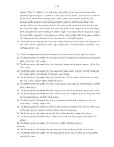 115spaces of the First Mystery, he, therefore, who shall receive that mystery, hath the power to pass through all the orders of the spaces of the three Thrice-spirituals and the three spaces of the First Mystery and all their orders, and hath the power to pass through all the orders of the Inheritances of the Light, to pass through them from without within and from within without and from above below and from below above and from the height to the depth and from the depth to the height and from the length to the breadth and from the breadth to the length; in a word, he hath the power to pass through all the regions of the Inheritances of the Light, and he hath the power to bide in the region where he pleaseth, in the Inheritance of the Light-kingdom.10. \the orders of the Inheritance of the Light. And he who shall receive that mystery of the Ineffable which I am.11. \12. \light of the lights hath arisen.13. \hath arisen.14. \the region of the Inheritances of the Light have arisen.15. \the rest of the kingdom of the light hath arisen.16. \Light have arisen.17. \18. \all the emanations of the light have arisen.19. \mysteries of the light have arisen.20. \of the light, so that the fire should not harm them, have arisen.21. \22. \arisen.23. \24. eaves25. \26. \souls hath arisen.