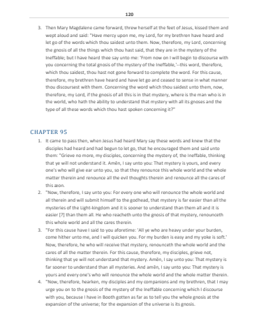 1203. Then Mary Magdalene came forward, threw herself at the feet of Jesus, kissed them and wept aloud and said: \let go of the words which thou saidest unto them. Now, therefore, my Lord, concerning the gnosis of all the things which thou hast said, that they are in the mystery of the Ineffable; but I have heard thee say unto me: 'From now on I will begin to discourse with you concerning the total gnosis of the mystery of the Ineffable,'--this word, therefore, which thou saidest, thou hast not gone forward to complete the word. For this cause, therefore, my brethren have heard and have let go and ceased to sense in what manner thou discoursest with them. Concerning the word which thou saidest unto them, now, therefore, my Lord, if the gnosis of all this is in that mystery, where is the man who is in the world, who hath the ability to understand that mystery with all its gnoses and the type of all these words which thou hast spoken concerning it?\CHAPTER 951. It came to pass then, when Jesus had heard Mary say these words and knew that the disciples had heard and had begun to let go, that he encouraged them and said unto them: \that ye will not understand it. Am%u0113n, I say unto you: That mystery is yours, and every one's who will give ear unto you, so that they renounce this whole world and the whole matter therein and renounce all the evil thoughts therein and renounce all the cares of this %u00e6on.2. \all therein and will submit himself to the godhead, that mystery is far easier than all the mysteries of the Light-kingdom and it is sooner to understand than them all and it is easier [?] than them all. He who reacheth unto the gnosis of that mystery, renounceth this whole world and all the cares therein.3. \come hither unto me, and I will quicken you. For my burden is easy and my yoke is soft.' Now, therefore, he who will receive that mystery, renounceth the whole world and the cares of all the matter therein. For this cause, therefore, my disciples, grieve not, thinking that ye will not understand that mystery. Am%u0113n, I say unto you: That mystery is far sooner to understand than all mysteries. And am%u0113n, I say unto you: That mystery is yours and every one's who will renounce the whole world and the whole matter therein.4. %urge you on to the gnosis of the mystery of the Ineffable concerning which I discourse with you, because I have in Booth gotten as far as to tell you the whole gnosis at the expansion of the universe; for the expansion of the universe is its gnosis.