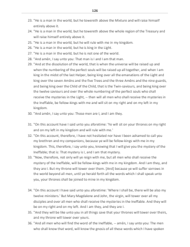 12623. \entirely above it.24. \will raise himself entirely above it.25. \26. \27. \28. \29. \when the numbering of the perfect souls will be raised up all together, and when I am king in the midst of the last Helper, being king over all the emanations of the Light and king over the seven Am%u0113ns and the five Trees and the three Am%u0113ns and the nine guards, and being king over the Child of the Child, that is the Twin-saviours, and being king over the twelve saviours and over the whole numbering of the perfect souls who shall receive the mysteries in the Light, -- then will all men who shall receive the mysteries in the Ineffable, be fellow-kings with me and will sit on my right and on my left in my kingdom.30. \31. \and on my left in my kingdom and will rule with me.'32. \my brethren and my companions, because ye will be fellow-kings with me in my kingdom. This, therefore, I say unto you, knowing that I will give you the mystery of the Ineffable; that is: That mystery is I, and I am that mystery.33. \mystery of the Ineffable, will be fellow-kings with me in my kingdom. And I am they, and they are I. But my throne will tower over them. [And] because ye will suffer sorrows in the world beyond all men, until ye herald forth all the words which I shall speak unto you, your thrones shall be joined to mine in my kingdom.34. \twelve ministers.' But Mary Magdalene and John, the virgin, will tower over all my disciples and over all men who shall receive the mysteries in the Ineffable. And they will be on my right and on my left. And I am they, and they are I.35. \and my throne will tower over yours.36. \who shall know that word, will know the gnosis of all these words which I have spoken