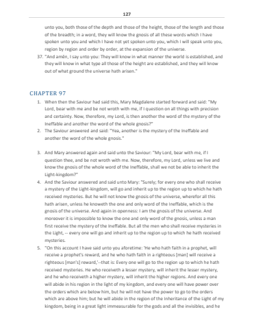 127unto you, both those of the depth and those of the height, those of the length and those of the breadth; in a word, they will know the gnosis of all these words which I have spoken unto you and which I have not yet spoken unto you, which I will speak unto you, region by region and order by order, at the expansion of the universe.37. \they will know in what type all those of the height are established, and they will know out of what ground the universe hath arisen.\CHAPTER 971. When then the Saviour had said this, Mary Magdalene started forward and said: \Lord, bear with me and be not wroth with me, if I question on all things with precision and certainty. Now, therefore, my Lord, is then another the word of the mystery of theIneffable and another the word of the whole gnosis?\2. The Saviour answered and said: \another the word of the whole gnosis.\3. And Mary answered again and said unto the Saviour: \question thee, and be not wroth with me. Now, therefore, my Lord, unless we live and know the gnosis of the whole word of the Ineffable, shall we not be able to inherit the Light-kingdom?\4. And the Saviour answered and said unto Mary: \a mystery of the Light-kingdom, will go and inherit up to the region up to which he hath received mysteries. But he will not know the gnosis of the universe, wherefor all this hath arisen, unless he knoweth the one and only word of the Ineffable, which is the gnosis of the universe. And again in openness: I am the gnosis of the universe. And moreover it is impossible to know the one and only word of the gnosis, unless a man first receive the mystery of the Ineffable. But all the men who shall receive mysteries in the Light, -- every one will go and inherit up to the region up to which he hath received mysteries.5. \receive a prophet's reward, and he who hath faith in a righteous [man] will receive a righteous [man's] reward,'--that is: Every one will go to the region up to which he hath received mysteries. He who receiveth a lesser mystery, will inherit the lesser mystery, and he who receiveth a higher mystery, will inherit the higher regions. And every one will abide in his region in the light of my kingdom, and every one will have power over the orders which are below him, but he will not have the power to go to the orders which are above him; but he will abide in the region of the Inheritance of the Light of my kingdom, being in a great light immeasurable for the gods and all the invisibles, and he