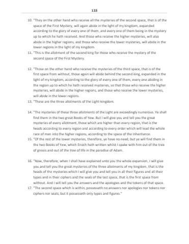 13310. \space of the First Mystery, will again abide in the light of my kingdom, expanded according to the glory of every one of them, and every one of them being in the mystery up to which he hath received. And those who receive the higher mysteries, will also abide in the higher regions, and those who receive the lower mysteries, will abide in the lower regions in the light of my kingdom.11. \second space of the First Mystery.12. \first space from without, those again will abide behind the second king, expanded in the light of my kingdom, according to the glory of every one of them, every one abiding in the region up to which he hath received mysteries, so that those who receive the higher mysteries, will abide in the higher regions, and those who receive the lower mysteries, will abide in the lower regions.13. \14. \find them in the two great Books of Yew. But I will give you and tell you the great mysteries of every allotment, those which are higher than every region, that is the heads according to every region and according to every order which will lead the whole race of men into the higher regions, according to the space of the Inheritance.15. \the two Books of Yew, which Enoch hath written whilst I spake with him out of the tree of gnosis and out of the tree of life in the paradise of Adam.16. \you and tell you the great mysteries of the three allotments of my kingdom, that is the heads of the mysteries which I will give you and tell you in all their figures and all their types and in their ciphers and the seals of the last space, that is the first space from without. And I will tell you the answers and the apologies and the tokens of that space.17. \ciphers nor seals; but it possesseth only types and figures.\