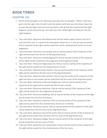 138BOOK THREECHAPTER 1021. JESUS continued again in the discourse and said unto his disciples: \gone into the Light, then herald it unto the whole world and say unto them: Cease not to seek day and night and remit not yourselves until ye find the mysteries of the Lightkingdom, which will purify you and make you into refined light and lead you into the Light-kingdom.2. \care and all its sins, in a word all its associations which are in it, that ye may be worthy of the mysteries of the Light and be saved from all the chastisements which are in the judgments.3. \Light and be saved from the fire of the dog-faced [one].4. \of the Light] and be saved from the judgments of the dog-faced [one].5. \the Light and be saved from the chastisements of Ari%u0113l.6. \Light and be saved from the fire-rivers of the dog-faced [one].7. \Light and that ye may escape and be saved from the fire-rivers of the dog-faced [one].8. \mysteries of the Light and be saved from the fire-pits of Ari%u0113l.9. \Light and be saved from the judgments of Amente.10. \and be saved from the fires of Amente.11. \Light and be saved from the chastisements which are in Amente.12. \and be saved from the fire-rivers of the dog-faced [one].13. \the Light and be saved from the pitch and fire-coals of the dog-faced [one].14. \and be saved from the fire-rivers of Ari%u0113l.15. \the Light and be saved from the chastisements of the fire-rivers . . . .