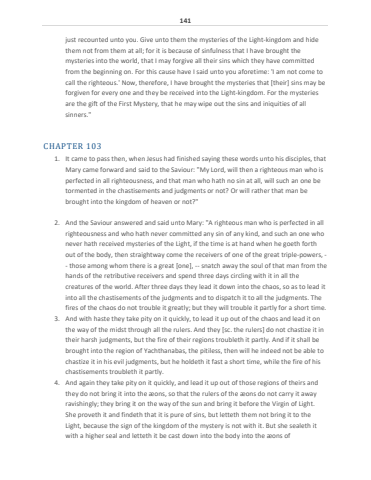 141just recounted unto you. Give unto them the mysteries of the Light-kingdom and hide them not from them at all; for it is because of sinfulness that I have brought the mysteries into the world, that I may forgive all their sins which they have committed from the beginning on. For this cause have I said unto you aforetime: 'I am not come to call the righteous.' Now, therefore, I have brought the mysteries that [their] sins may be forgiven for every one and they be received into the Light-kingdom. For the mysteries are the gift of the First Mystery, that he may wipe out the sins and iniquities of all sinners.\CHAPTER 1031. It came to pass then, when Jesus had finished saying these words unto his disciples, that Mary came forward and said to the Saviour: \perfected in all righteousness, and that man who hath no sin at all, will such an one be tormented in the chastisements and judgments or not? Or will rather that man be brought into the kingdom of heaven or not?\2. And the Saviour answered and said unto Mary: \righteousness and who hath never committed any sin of any kind, and such an one who never hath received mysteries of the Light, if the time is at hand when he goeth forth out of the body, then straightway come the receivers of one of the great triple-powers, -- those among whom there is a great [one], -- snatch away the soul of that man from the hands of the retributive receivers and spend three days circling with it in all the creatures of the world. After three days they lead it down into the chaos, so as to lead it into all the chastisements of the judgments and to dispatch it to all the judgments. The fires of the chaos do not trouble it greatly; but they will trouble it partly for a short time.3. And with haste they take pity on it quickly, to lead it up out of the chaos and lead it on the way of the midst through all the rulers. And they [sc. the rulers] do not chastize it in their harsh judgments, but the fire of their regions troubleth it partly. And if it shall be brought into the region of Yachthanabas, the pitiless, then will he indeed not be able to chastize it in his evil judgments, but he holdeth it fast a short time, while the fire of his chastisements troubleth it partly.4. And again they take pity on it quickly, and lead it up out of those regions of theirs and they do not bring it into the %u00e6ons, so that the rulers of the %u00e6ons do not carry it away ravishingly; they bring it on the way of the sun and bring it before the Virgin of Light. She proveth it and findeth that it is pure of sins, but letteth them not bring it to the Light, because the sign of the kingdom of the mystery is not with it. But she sealeth it with a higher seal and letteth it be cast down into the body into the %u00e6ons of