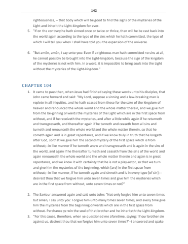 142righteousness, -- that body which will be good to find the signs of the mysteries of the Light and inherit the Light-kingdom for ever.5. \the world again according to the type of the sins which he hath committed, the type of which I will tell you when I shall have told you the expansion of the universe.6. \he cannot possibly be brought into the Light-kingdom, because the sign of the kingdom of the mysteries is not with him. In a word, it is impossible to bring souls into the Light without the mysteries of the Light-kingdom.\CHAPTER 1041. It came to pass then, when Jesus had finished saying these words unto his disciples, that John came forward and said: \replete in all iniquities, and he hath ceased from these for the sake of the kingdom of heaven and renounced the whole world and the whole matter therein, and we give him from the be-ginning onwards the mysteries of the Light which are in the first space from without, and if he receiveth the mysteries, and after a little while again if he returneth and transgresseth, and thereafter again if he turneth and ceaseth from all sins and turneth and renounceth the whole world and the whole matter therein, so that he cometh again and is in great repentance, and if we know truly in truth that he longeth after God, so that we give him the second mystery of the first space which is from without;--in like manner if he turneth anew and transgresseth and is again in the sins of the world, and again if he thereafter turneth and ceaseth from the sins of the world and again renounceth the whole world and the whole matter therein and again is in great repentance, and we know it with certainty that he is not a play-actor, so that we turn and give him the mysteries of the beginning, which [are] in the first space from without;--in like manner, if he turneth again and sinneth and is in every type [of sin];--desirest thou that we forgive him unto seven times and give him the mysteries which are in the first space from without, unto seven times or not?\2. The Saviour answered again and said unto John: \but am%u0113n, I say unto you: Forgive him unto many times seven times, and every time give him the mysteries from the beginning onwards which are in the first space from without. Perchance ye win the soul of that brother and he inheriteth the Light-kingdom.3. \against us, desirest thou that we forgive him unto seven times?'--I answered and spake