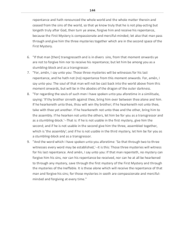 144repentance and hath renounced the whole world and the whole matter therein and ceased from the sins of the world, so that ye know truly that he is not play-acting but longeth truly after God, then turn ye anew, forgive him and receive his repentance, because the First Mystery is compassionate and merciful-minded; let also that man pass through and give him the three mysteries together which are in the second space of the First Mystery.6. \are not to forgive him nor to receive his repentance; but let him be among you as a stumbling-block and as a transgressor.7. \repentance, and he hath not (no) repentance from this moment onwards. For, am%u0113n, I say unto you: The soul of that man will not be cast back into the world above from this moment onwards, but will be in the abodes of the dragon of the outer darkness.8. \saying: 'If thy brother sinneth against thee, bring him over between thee alone and him. If he hearkeneth unto thee, thou wilt win thy brother; if he hearkeneth not unto thee, take with thee yet another. If he hearkeneth not unto thee and the other, bring him to the assembly. If he hearken not unto the others, let him be for you as a transgressor and as a stumbling-block.'--That is: If he is not usable in the first mystery, give him the second; and if he is not usable in the second give him the three, assembled together, which is 'the assembly'; and if he is not usable in the third mystery, let him be for you as a stumbling-block and as a transgressor.9. \witnesses every word may be established,'--it is this: Those three mysteries will witness for his last repentance. And am%u0113n, I say unto you: If that man repenteth, no mystery can forgive him his sins, nor can his repentance be received, nor can he at all be hearkened to through any mystery, save through the first mystery of the First Mystery and through the mysteries of the Ineffable. It is these alone which will receive the repentance of that man and forgive his sins; for those mysteries in sooth are compassionate and mercifulminded and forgiving at every time.\