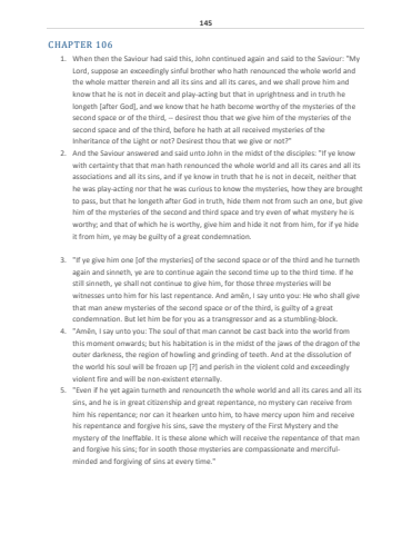 145CHAPTER 1061. When then the Saviour had said this, John continued again and said to the Saviour: \Lord, suppose an exceedingly sinful brother who hath renounced the whole world and the whole matter therein and all its sins and all its cares, and we shall prove him and know that he is not in deceit and play-acting but that in uprightness and in truth he longeth [after God], and we know that he hath become worthy of the mysteries of the second space or of the third, -- desirest thou that we give him of the mysteries of the second space and of the third, before he hath at all received mysteries of the Inheritance of the Light or not? Desirest thou that we give or not?\2. And the Saviour answered and said unto John in the midst of the disciples: \with certainty that that man hath renounced the whole world and all its cares and all its associations and all its sins, and if ye know in truth that he is not in deceit, neither that he was play-acting nor that he was curious to know the mysteries, how they are brought to pass, but that he longeth after God in truth, hide them not from such an one, but give him of the mysteries of the second and third space and try even of what mystery he is worthy; and that of which he is worthy, give him and hide it not from him, for if ye hide it from him, ye may be guilty of a great condemnation.3. \again and sinneth, ye are to continue again the second time up to the third time. If he still sinneth, ye shall not continue to give him, for those three mysteries will be witnesses unto him for his last repentance. And am%u0113n, I say unto you: He who shall give that man anew mysteries of the second space or of the third, is guilty of a great condemnation. But let him be for you as a transgressor and as a stumbling-block.4. \this moment onwards; but his habitation is in the midst of the jaws of the dragon of the outer darkness, the region of howling and grinding of teeth. And at the dissolution of the world his soul will be frozen up [?] and perish in the violent cold and exceedingly violent fire and will be non-existent eternally.5. \sins, and he is in great citizenship and great repentance, no mystery can receive from him his repentance; nor can it hearken unto him, to have mercy upon him and receive his repentance and forgive his sins, save the mystery of the First Mystery and the mystery of the Ineffable. It is these alone which will receive the repentance of that man and forgive his sins; for in sooth those mysteries are compassionate and mercifulminded and forgiving of sins at every time.\
