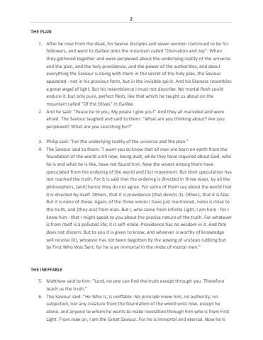 2THE PLAN1. After he rose from the dead, his twelve disciples and seven women continued to be his followers, and went to Galilee onto the mountain called \they gathered together and were perplexed about the underlying reality of the universe and the plan, and the holy providence, and the power of the authorities, and about everything the Saviour is doing with them in the secret of the holy plan, the Saviourappeared - not in his previous form, but in the invisible spirit. And his likeness resembles a great angel of light. But his resemblance I must not describe. No mortal flesh could endure it, but only pure, perfect flesh, like that which he taught us about on the mountain called \2. And he said: \afraid. The Saviour laughed and said to them: \perplexed? What are you searching for?\3. Philip said: \4. The Saviour said to them: \foundation of the world until now, being dust, while they have inquired about God, who he is and what he is like, have not found him. Now the wisest among them have speculated from the ordering of the world and (its) movement. But their speculation has not reached the truth. For it is said that the ordering is directed in three ways, by all the philosophers, (and) hence they do not agree. For some of them say about the world that it is directed by itself. Others, that it is providence (that directs it). Others, that it is fate. But it is none of these. Again, of the three voices I have just mentioned, none is close to the truth, and (they are) from man. But I, who came from Infinite Light, I am here - for I know him - that I might speak to you about the precise nature of the truth. For whatever is from itself is a polluted life; it is self-made. Providence has no wisdom in it. And fate does not discern. But to you it is given to know; and whoever is worthy of knowledge will receive (it), whoever has not been begotten by the sowing of unclean rubbing but by First Who Was Sent, for he is an immortal in the midst of mortal men.\THE INEFFABLE5. Matthew said to him: \teach us the truth.\6. The Saviour said: \subjection, nor any creature from the foundation of the world until now, except he alone, and anyone to whom he wants to make revelation through him who is from First Light. From now on, I am the Great Saviour. For he is immortal and eternal. Now he is