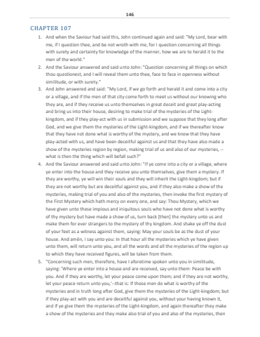 146CHAPTER 1071. And when the Saviour had said this, John continued again and said: \me, if I question thee, and be not wroth with me, for I question concerning all things with surety and certainty for knowledge of the manner, how we are to herald it to the men of the world.\2. And the Saviour answered and said unto John: \thou questionest, and I will reveal them unto thee, face to face in openness without similitude, or with surety.\3. And John answered and said: \or a village, and if the men of that city come forth to meet us without our knowing who they are, and if they receive us unto themselves in great deceit and great play-acting and bring us into their house, desiring to make trial of the mysteries of the Lightkingdom, and if they play-act with us in submission and we suppose that they long after God, and we give them the mysteries of the Light-kingdom, and if we thereafter know that they have not done what is worthy of the mystery, and we know that they have play-acted with us, and have been deceitful against us and that they have also made a show of the mysteries region by region, making trial of us and also of our mysteries, --what is then the thing which will befall such?\4. And the Saviour answered and said unto John: \ye enter into the house and they receive you unto themselves, give them a mystery. If they are worthy, ye will win their souls and they will inherit the Light-kingdom; but if they are not worthy but are deceitful against you, and if they also make a show of the mysteries, making trial of you and also of the mysteries, then invoke the first mystery of the First Mystery which hath mercy on every one, and say: Thou Mystery, which we have given unto these impious and iniquitous souls who have not done what is worthy of thy mystery but have made a show of us, turn back [then] the mystery unto us and make them for ever strangers to the mystery of thy kingdom. And shake ye off the dust of your feet as a witness against them, saying: May your souls be as the dust of your house. And am%u0113n, I say unto you: In that hour all the mysteries which ye have given unto them, will return unto you, and all the words and all the mysteries of the region up to which they have received figures, will be taken from them.5. \saying: 'Where ye enter into a house and are received, say unto them: Peace be with you. And if they are worthy, let your peace come upon them; and if they are not worthy, let your peace return unto you,'--that is: If those men do what is worthy of the mysteries and in truth long after God, give them the mysteries of the Light-kingdom; but if they play-act with you and are deceitful against you, without your having known it, and if ye give them the mysteries of the Light-kingdom, and again thereafter they make a show of the mysteries and they make also trial of you and also of the mysteries, then
