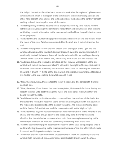 151the height; the soul on the other hand senseth to seek after the region of righteousness which is mixed, which is the region of the commixture; the counterfeiting spirit on the other hand seeketh after all evils and lusts and all sins; the body on the contrary senseth nothing unless it taketh up force out of the matter.8. \retributive receivers assign the servitors to follow them and be witnesses of all the sins which they commit, with a view to the manner and method how they will chastize them in the judgments.9. \the rulers of the great Fate have commanded for the soul, and it maketh them for the soul.10. \whole god-head; and the counterfeiting spirit leadeth away the soul and compelleth it continually to do all its lawless deeds, all its mischiefs and all its sin, and is persistently allotted to the soul and is hostile to it, and making it do all this evil and all these sins.11. \which it will make it do. Moreover also if it will rest in the night [or] by day, it stirreth it in dreams or in lusts of the world, and maketh it to lust after all the things of the world. In a word, it driveth [?] it into all the things which the rulers have commanded for it and it is hostile to the soul, making it do what pleaseth it not.12. \doeth all sins.13. \leadeth the man unto death through the rulers and their bonds with which they are bound through the Fate.14. \thereafter the retributive receivers spend three days circling round with that soul in all the regions and dispatch it to all the %u00e6ons of the world. And the counterfeiting spirit and the destiny follow that soul; and the power returneth to the Virgin of Light.15. \chaos; and when they bring it down to the chaos, they hand it over to those who chastize. And the retributive receivers return unto their own regions according to the economy of the works of the rulers concerning the coming-forth of the souls.16. \and transferring it according to the chastisement because of the sins which it hath made it commit, and is in great enmity to the soul.17. \which it hath committed, the counterfeiting spirit leadeth it forth out of the chaos,