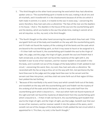 1565. \spoken unto us: 'The counterfeiting spirit is hostile to the soul, making it do all sins and all mischiefs, and it transferreth it in the chastisements because of all the sins which it hath made it commit; in a word, it is hostile to the soul in every way,'--concerning this word, therefore, thou hast said unto us aforetime: 'The foes of the man are the dwellers in his house,'--that is: The dwellers in the house of the soul are the counterfeiting spirit and the destiny, which are hostile to the soul the whole time, making it commit all sin and all iniquities. Lo this, my Lord, is the third thought.6. \soul goeth forth out of the body and travelleth on the way with the counterfeiting spirit, and if it hath not found the mystery of the undoing of all the bonds and the seals which are bound to the counterfeiting spirit, so that it may cease to haunt or be assigned to it, -- if it then hath not found it, the counterfeiting spirit leadeth the soul to the Virgin of Light, the judge; and the judge, the Virgin of Light, proveth the soul and findeth that it hath sinned and, as she also hath not found the mysteries of the Light with it, she handeth it over to one of her receivers, and her receiver leadeth it and casteth it into the body, and it cometh not out of the changes of the body before it hath yielded its last circuit,'--concerning this word, then, my Lord, thou hast said unto us aforetime: 'Be reconciled with thy foe as long as thou art on the way with him, lest perchance thy foe hand thee over to the judge and the judge hand thee over to the servant and the servant cast thee into prison, and thou shalt not come forth out of that region till thou hast yielded the last farthing.'7. \and travelleth on the way with the counterfeiting spirit and findeth not the mystery of the undoing of all the seals and all the bonds, so that it may undo itself from the counterfeiting spirit which is bound to it, -- that soul which hath not found mysteries of the Light and hath not found the mysteries of detachment from the counterfeiting spirit which is bound to it, -- if then it hath not found it, the counterfeiting spirit leadeth that soul to the Virgin of Light, and the Virgin of Light, yea that judge, handeth over that soul to one of her receivers, and her receiver casteth it into the sphere of the %u00e6ons, and it cometh not out of the changes of the body before it hath yielded the last circuit which is appointed for it. This then, my Lord, is the fourth thought.\