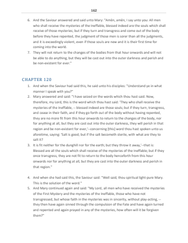 1626. And the Saviour answered and said unto Mary: \who shall receive the mysteries of the Ineffable, blessed indeed are the souls which shall receive of those mysteries; but if they turn and transgress and come out of the body before they have repented, the judgment of those men is sorer than all the judgments, and it is exceedingly violent, even if those souls are new and it is their first time for coming into the world. 7. They will not return to the changes of the bodies from that hour onwards and will not be able to do anything, but they will be cast out into the outer darkness and perish and be non-existent for ever.\CHAPTER 1201. And when the Saviour had said this, he said unto his disciples: \manner I speak with you?\2. Mary answered and said: \therefore, my Lord, this is the word which thou hast said: 'They who shall receive the mysteries of the Ineffable, -- blessed indeed are those souls; but if they turn, transgress, and cease in their faith, and if they go forth out of the body without having repented, they are no more fit from this hour onwards to return to the changes of the body, nor for anything at all, but they are cast out into the outer darkness, they will perish in that region and be non-existent for ever,'--concerning [this] word thou hast spoken unto us aforetime, saying: 'Salt is good; but if the salt becometh sterile, with what are they to salt it? 3. It is fit neither for the dunghill nor for the earth; but they throw it away,'--that is: Blessed are all the souls which shall receive of the mysteries of the Ineffable; but if they once transgress, they are not fit to return to the body henceforth from this hour onwards nor for anything at all, but they are cast into the outer darkness and perish in that region.\4. And when she had said this, the Saviour said: \This is the solution of the word.\5. And Mary continued again and said: \of the First Mystery and the mysteries of the Ineffable, those who have not transgressed, but whose faith in the mysteries was in sincerity, without play-acting, --they then have again sinned through the compulsion of the Fate and have again turned and repented and again prayed in any of the mysteries, how often will it be forgiven them?\