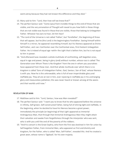 4went astray because they had not known this difference and they died.\13. Mary said to him: \14. The perfect Saviour said: \visible, and the very emanation of Thought will reveal to you how faith in those things that are not visible was found in those that are visible, those that belong to Unbegotten Father. Whoever has ears to hear, let him hear!15. \that will appear, but he (the Lord) is the beginningless Forefather. Seeing himself within himself in a mirror, he appeared resembling himself, but his likeness appeared as Divine Self-Father, and Confronter over the Confronted ones, First Existent Unbegotten Father. He is indeed of equal age the Light that is before him, but he is not equal to him in power.16. \equal in age and power, being in glory (and) without number, whose race is called 'The Generation over Whom There Is No Kingdom' from the one in whom you yourselves have appeared from these men. And that whole multitude over which there is no kingdom is called 'Sons of Unbegotten Father, God, Saviour, Son of God,' whose likeness is with you. Now he is the unknowable, who is full of ever-imperishable glory and ineffable joy. They all are at rest in him, ever rejoicing in ineffable joy in his unchanging glory and measureless jubilation; this was never heard or known among all the aeons and their worlds until now.\REVELATION OF MAN17. Matthew said to him: \18. The perfect Saviour said: \in infinity, Self-grown, Self-constructed Father, being full of shining light and ineffable, in the beginning, when he decided to have his likeness become a great power, immediately the principle (or beginning) of that Light appeared as Immortal Androgynous Man, that through that Immortal Androgynous Man they might attain their salvation and awake from forgetfulness through the interpreter who was sent, who is with you until the end of the poverty of the robbers.19. \Self-begotten Father, from Immortal Man, who appeared as First and divinity and kingdom, for the Father, who is called 'Man, Self-Father', revealed this. And he created a great aeon, whose name is 'Ogdoad', for his own majesty.