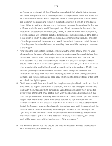 175performed no mystery at all, then if they have completed their circuits in the changes, and if such men go forth out of the body without having repented anew, and if they are led into the chastisements which [are] in the midst of the dragon of the outer darkness, and remain in the circuits and remain in the chastisements in the midst of the dragon, --these, if they know the mystery of one of the twelve names of the angels while they are in life and are in the world, and if they speak one of their names while they are in the midst of the chastisements of the dragon, -- then, at the hour when they shall speak it, the whole dragon will be tossed about and most exceedingly convulsed, and the door of the dungeon in which the souls of those men are, openeth itself upward, and the ruler of the dungeon in which those men are, casteth the souls of those men out of the midst of the dragon of the outer darkness, because they have found the mystery of the name of the dragon.7. \who watch the dungeons of that region, hasten to snatch away those souls to lead them before Yew, the First Man, the Envoy of the First Commandment. And Yew, the First Man, seeth the souls and proveth them; he findeth that they have completed their circuits and that it is not lawful to bring them anew into the world, for it is not lawful to bring anew into the world all souls which are cast into the outer darkness. [But] if they have not yet completed their number of circuits in the changes of the body, the receivers of Yew keep them with them until they perform for them the mystery of the Ineffable, and remove them into a good body which shall find the mysteries of the Light and inherit the Light-kingdom.8. \is not lawful to [re]turn them anew to the world, and that also the sign of the Ineffable is not with them, then Yew hath compassion upon them and leadeth them before the seven virgins of the Light. They baptize them with their baptisms, but they do not give them the spiritual chrism. And they lead them into the Treasury of the Light, but they do not put them in the orders of the Inheritance, because no sign and no seal of the Ineffable is with them. But they save them from all chastisements and put them into the light of the Treasury, separated and apart by themselves alone until the ascension of the universe. And at the time when they will draw apart the veils of the Treasury of the Light, they cleanse those souls anew and purify them most exceedingly and give them anew mysteries and put them in the last order which [is] in the Treasury, and those souls will be saved from all the chastisements of the judgments.\9. And when the Saviour had said this, he said unto his disciples: \what manner I discourse with you?\