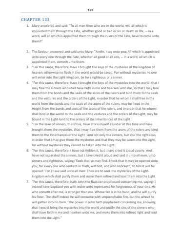 183CHAPTER 1331. Mary answered and said: \appointed them through the Fate, whether good or bad or sin or death or life, -- in a word, will all which is appointed them through the rulers of the Fate, have to come unto them?\2. The Saviour answered and said unto Mary: %unto every one through the Fate, whether all good or all sins, -- in a word, all which is appointed them, cometh unto them.3. \heaven; otherwise no flesh in the world would be saved. For without mysteries no one will enter into the Light-kingdom, be he a righteous or a sinner.4. \may free the sinners who shall have faith in me and hearken unto me, so that I may free them from the bonds and the seals of the %u00e6ons of the rulers and bind them to the seals and the vestures and the orders of the Light, in order that he whom I shall free in the world from the bonds and the seals of the %u00e6ons of the rulers, may be freed in the Height from the bonds and seals of the %u00e6ons of the rulers, and in order that he whom I shall bind in the world to the seals and the vestures and the orders of the Light, may be bound in the Light-land to the orders of the Inheritances of the Light .5. \brought them the mysteries, that I may free them from the %u00e6ons of the rulers and bind them to the Inheritances of the Light , and not only the sinners, but also the righteous, in order that I may give them the mysteries and that they may be taken into the Light, for without mysteries they cannot be taken into the Light.6. \have not separated the sinners, but I have cried it aloud and said it unto all men, unto sinners and righteous, saying: 'Seek that ye may find, knock that it may be opened unto you; for every one who seeketh in truth, will find, and who knocketh, to him it will be opened.' For I have said unto all men: They are to seek the mysteries of the Lightkingdom which shall purify them and make them refined and lead them into the Light.7. \indeed have baptized you with water unto repentance for forgiveness of your sins. He who cometh after me, is stronger than me. Whose fan is in his hand, and he will purify his floor. The chaff indeed he will consume with unquenchable fire, but the wheat he will gather into his barn.' The power in John hath prophesied concerning me, knowing that I would bring the mysteries into the world and purify the sins of the sinners who shall have faith in me and hearken unto me, and make them into refined light and lead them into the Light.\