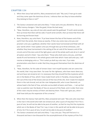 184CHAPTER 1341. When then Jesus had said this, Mary answered and said: \and they come upon the doctrines of error, I whence then are they to know whether they belong to thee or not?\2. The Saviour answered and said unto Mary: \skilful money-changers. Take the good, throw the bad away.'3. \then ye know that there will be cold; if south wind cometh, then ye know that there will be burning and fervent heat.' 4. Now, therefore, say unto them: 'If ye have known the face of the heaven and of the earth from the winds, then know ye exactly, if then any come now unto you and proclaim unto you a godhead, whether their words have harmonized and fitted with all your words which I have spoken unto you through two up to three witnesses, and whether they have harmonized in the setting of the air and of the heavens and of the circuits and of the stars and of the light-givers and of the whole earth and all on it and of all waters and all in them.' Say unto them: 'Those who shall come unto you, and their words fit and harmonize in the whole gnosis with that which I have said unto you, I will receive as belonging unto us.' This is what ye shall say unto men, if ye make proclamation unto them in order that they may guard themselves from the doctrines of error.5. \the world, that I may save them. For even for the righteous, who have never done any evil and have not sinned at all, it is necessary that they should find the mysteries which are in the Books of Yew, which I have made Enoch write in Paradise, discoursing with him out of the tree of the Gnosis and out of the tree of the Life. And I made him deposit them in the rock Ararad, and set the ruler Kalapataur%u014dth, who is over Skemm%u016bt, on whose head is the foot of Yew, and who surroundeth all %u00e6ons and Fates, -- I set up that ruler as watcher over the Books of Yew on account of the flood, and in order that none of the rulers may be envious of them and destroy them. These will I give you, when I shall have told you the expansion of the universe.\6. When then the Saviour had said this, Mary answered and said: \is the man in the world who hath not sinned at all, who is pure of iniquities? For if he is pure of one, he will not be able to be pure of another, so that he may find the mysteries which are in the Books of Yew? For I say: A man in this world will not be able to be pure of sins; for if he is pure of one, he will not be able to be pure of another.\7. The Saviour answered and said unto Mary: \thousand and two in ten-thousand for the accomplishment of the mystery of the First