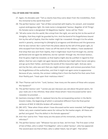6FALL OF MAN AND THE AEONS27. Again, his disciples said: \the immortal to the world that dies?\28. The perfect Saviour said: \a great androgynous light. His male name is designated 'Saviour, Begetter of All Things'. His female name is designated 'All-Begettress Sophia'. Some call her 'Pistis'.29. \Almighty, that they might be guarded by him. And the bond of his forgetfulness bound him by the will of Sophia, that the matter might be through it to the whole world in poverty, concerning his (Almighty's) arrogance and blindness and the ignorance that he was named. But I came from the places above by the will of the great Light, (I) who escaped from that bond; I have cut off the work of the robbers; I have awakened that drop that was sent from Sophia, that it might bear much fruit through me, and be perfected and not again be defective, but be through me, the Great Saviour, that his glory might be revealed, so that Sophia might also be justified in regard to that defect, that her sons might not again become defective but might attain honor and glory and go up to their Father, and know the words of the masculine Light. And you were sent by the Son, who was sent that you might receive Light, and remove yourselves from the forgetfulness of the authorities, and that it might not again come to appearance because of you, namely, the unclean rubbing that is from the fearful fire that came from their fleshly part. Tread upon their malicious intent.\30. Then Thomas said to him: \the heavens?\31. The perfect Saviour said: \your roots are in the infinities. Now when those whom I have discussed earlier were revealed, he provided ....32. [sections missing in NHC III, replaced here by the corresponding section in the Berlin Gnostic Codex, the beginning of which is somewhat different from the final partial sentence of NHC III 108 (the broken off sentence)]33. [BG 107]: \Father very soon created twelve aeons for retinue for the twelve angels. All these are perfect and good. Thus the defect in the female appeared.\34. And said to him: \infinities?\35. The perfect Saviour said: \of Son of Man, who is called 'First Begetter', who is called 'Saviour', who has appeared. The second aeon (is) that of Man, who is called 'Adam, Eye of Light'. That which