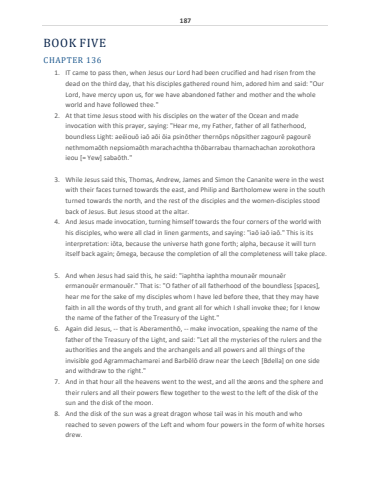 187BOOK FIVECHAPTER 1361. IT came to pass then, when Jesus our Lord had been crucified and had risen from the dead on the third day, that his disciples gathered round him, adored him and said: \Lord, have mercy upon us, for we have abandoned father and mother and the whole world and have followed thee.\2. At that time Jesus stood with his disciples on the water of the Ocean and made invocation with this prayer, saying: \boundless Light: ae%u0113iou%u014d ia%u014d a%u014di %u014dia psin%u014dther thern%u014dps n%u014dpsither zagour%u0113 pagour%u0113 nethmoma%u014dth nepsioma%u014dth marachachtha th%u014dbarrabau tharnachachan zorokothora ieou [= Yew] saba%u014dth.\3. While Jesus said this, Thomas, Andrew, James and Simon the Cananite were in the west with their faces turned towards the east, and Philip and Bartholomew were in the south turned towards the north, and the rest of the disciples and the women-disciples stood back of Jesus. But Jesus stood at the altar.4. And Jesus made invocation, turning himself towards the four corners of the world with his disciples, who were all clad in linen garments, and saying: \interpretation: i%u014dta, because the universe hath gone forth; alpha, because it will turn itself back again; %u014dmega, because the completion of all the completeness will take place.5. And when Jesus had said this, he said: \ermanou%u0113r ermanou%u0113r.\hear me for the sake of my disciples whom I have led before thee, that they may have faith in all the words of thy truth, and grant all for which I shall invoke thee; for I know the name of the father of the Treasury of the Light.\6. Again did Jesus, -- that is Aberamenth%u014d, -- make invocation, speaking the name of the father of the Treasury of the Light, and said: \authorities and the angels and the archangels and all powers and all things of the invisible god Agrammachamarei and Barb%u0113l%u014d draw near the Leech [Bdella] on one side and withdraw to the right.\7. And in that hour all the heavens went to the west, and all the %u00e6ons and the sphere and their rulers and all their powers flew together to the west to the left of the disk of the sun and the disk of the moon.8. And the disk of the sun was a great dragon whose tail was in his mouth and who reached to seven powers of the Left and whom four powers in the form of white horses drew.