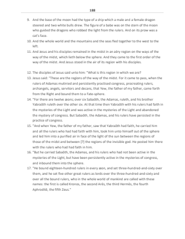 1889. And the base of the moon had the type of a ship which a male and a female dragon steered and two white bulls drew. The figure of a babe was on the stern of the moon who guided the dragons who robbed the light from the rulers. And on its prow was a cat's face.10. And the whole world and the mountains and the seas fled together to the west to the left.11. And Jesus and his disciples remained in the midst in an a%u00ebry region on the ways of the way of the midst, which lieth below the sphere. And they came to the first order of the way of the midst. And Jesus stood in the air of its region with his disciples.12. The disciples of Jesus said unto him: \13. Jesus said: \rulers of Adamas mutinied and persistently practised congress, procreating rulers, archangels, angels, servitors and decans, that Yew, the father of my father, came forth from the Right and bound them to a Fate-sphere.14. \Yabra%u014dth ruleth over the other six. At that time then Yabra%u014dth with his rulers had faith in the mysteries of the Light and was active in the mysteries of the Light and abandoned the mystery of congress. But Saba%u014dth, the Adamas, and his rulers have persisted in the practice of congress.15. \and all the rulers who had had faith with him, took him unto himself out of the sphere and led him into a purified air in face of the light of the sun between the regions of those of the midst and between [?] the regions of the invisible god. He posted him there with the rulers who had had faith in him.16. \mysteries of the Light, but have been persistently active in the mysteries of congress, and inbound them into the sphere.17. \them, and he set five other great rulers as lords over the three-hundred-and-sixty and over all the bound rulers, who in the whole world of mankind are called with these names: the first is called Kronos, the second Ar%u0113s, the third Herm%u0113s, the fourth Aphrodit%u0113, the fifth Zeus.\