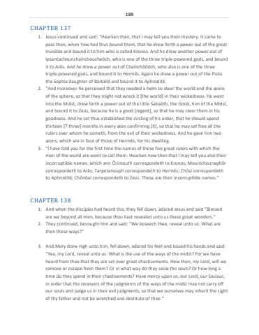 189CHAPTER 1371. Jesus continued and said: \pass then, when Yew had thus bound them, that he drew forth a power out of the great Invisible and bound it to him who is called Kronos. And he drew another power out of Ipsantachouncha%u00efnchouche%u014dch, who is one of the three triple-powered gods, and bound it to Ar%u0113s. And he drew a power out of Cha%u00efnch%u014d%u014d%u014dch, who also is one of the three triple-powered gods, and bound it to Herm%u0113s. Again he drew a power out of the Pistis the Sophia daughter of Barb%u0113l%u014d and bound it to Aphrodit%u0113.2. \of the sphere, so that they might not wreck it [the world] in their wickedness. He went into the Midst, drew forth a power out of the little Saba%u014dth, the Good, him of the Midst, and bound it to Zeus, because he is a good [regent], so that he may steer them in his goodness. And he set thus established the circling of his order, that he should spend thirteen [? three] months in every %u00e6on confirming [it], so that he may set free all the rulers over whom he cometh, from the evil of their wickedness. And he gave him two %u00e6ons, which are in face of those of Herm%u0113s, for his dwelling.3. \men of the world are wont to call them. Hearken now then that I may tell you also their incorruptible names, which are: %u014crimouth correspondeth to Kronos; Mounichounaph%u014dr correspondeth to Ar%u0113s; Tarpetanouph correspondeth to Herm%u0113s; Ch%u014dsi correspondeth to Aphrodit%u0113; Ch%u014dnbal correspondeth to Zeus. These are their incorruptible names.\CHAPTER 1381. And when the disciples had heard this, they fell down, adored Jesus and said \are we beyond all men, because thou hast revealed unto us these great wonders.\2. They continued, besought him and said: \then these ways?\3. And Mary drew nigh unto him, fell down, adored his feet and kissed his hands and said: \heard from thee that they are set over great chastisements. How then, my Lord, will we remove or escape from them? Or in what way do they seize the souls? Or how long a time do they spend in their chastisements? Have mercy upon us, our Lord, our Saviour, in order that the receivers of the judgments of the ways of the midst may not carry off our souls and judge us in their evil judgments, so that we ourselves may inherit the Light of thy father and not be wretched and destitute of thee.\