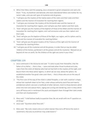 1904. When then Mary said this weeping, Jesus answered in great compassion and said unto them: \name's sake, unto you will I give all mysteries and all gnoses.5. \ciphers and the manner of invocation for reaching their regions.6. \invocation for reaching their regions, and I will give you their ciphers and their seals.7. \invocation for reaching their regions, and I will announce unto you their ciphers and their seals.8. \seals and the manner of invocation for reaching thither.9. \invocation for reaching thither.10. \'children of the fulness, perfected in all the gnoses and all the mysteries.' Blessed are ye beyond all men on earth, for the children of the Light are come in your time.\CHAPTER 1391. Jesus continued in the discourse and said: \father of my father, -- that is Yew, -- came and took other three-hundred-and-sixty rulers from the rulers of Adamas who had not had faith in the mystery of the Light, and bound them into these a%u00ebrial regions, in which we are now, below the sphere. He established another five great rulers over them, -- that is these who are on the way of the midst.2. \whose hair reacheth down to her feet, under whose authority stand five-and-twenty archdemons which rule over a multitude of other demons. And it is those demons which enter into men and seduce them, raging and cursing and slandering; and it is they which carry off hence and in ravishment the souls and dispatch them through their dark smoke and their evil chastisements.\3. Mary said: \all things.\4. Jesus said: \5. Mary said: \ravishment, that also my brethren may understand it.\