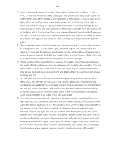 1916. Jesus, -- that is Aberamenth%u014d, -- said: \Yew, -- is the fore-minder of all the rulers, gods and powers who have arisen out of the matter of the Light of the Treasury, and Zorokothora Melchisedec is the envoy to all the lights which are purified in the rulers, leading them into the Treasury of the Light, --these two alone are the great Lights, and their ordinance is that they down go to the rulers and purify them, and that Zorokothora Melchisedec carrieth away the purification of the lights which they have purified in the rulers and leadeth them into the Treasury of the Light, -- when the cipher and the time of their ordinance cometh, that they go down to the rulers and oppress and constrain them, carrying away the purification from the rulers.7. \to the regions of the Treasury of the Light, it cometh to pass that, if they reach the regions of the Midst, Zorokothora Melchisedec carrieth off the lights and leadeth them unto the gate of those of the Midst and leadeth them into the Treasury of the Light, and that Yew withdraweth himself into the regions of those of the Right.8. \the wrath of their wickedness, going straightway up to the lights, because they [Yew and Melchisedec] are not with them at that time, and they carry off the souls which they may be able to snatch away in ravishment, and destroy them through their dark smoke and their evil fire.9. \stand under her, carrieth off the souls of the violently passionate, of cursers and of slanderers and dispatcheth them through the dark smoke and destroyeth them through her evil fire, so that they begin to be undone and dissolved. One-hundred-and-thirtyand-three years and nine months do they spend in the chastisements of her regions, while she tormenteth them in the fire of her wickedness.10. \little Saba%u014dth, Zeus, cometh to the first of the %u00e6ons of the sphere, which is called in the world the Ram of Boubastis, that is of Aphrodit%u0113; [and] when she [Boubastis] cometh to the seventh house of the sphere, that is to the Balance, then the veils which are between those of the Right and those of the Left, draw themselves aside, and there looketh from the height out of those of the Right the great Saba%u014dth, the Good; and the whole world and the total sphere [become alarmed] before he hath looked forth. And he looketh down on the regions of Parapl%u0113x, so that her regions may be dissolved and perish. And all the souls which are in her chastisements, are carried and cast back [up] into the sphere anew, because they are ruined in the chastisements of Parapl%u0113x.\