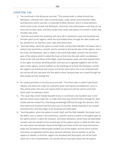 192CHAPTER 1401. \%u00c6thiopian, a female ruler, who is entirely black, under whom stand fourteen other [arch]demons which rule over a multitude of other demons. And it is those demons which stand under Ariouth the %u00c6thiopian, that enter into strife-seekers until they stir up wars and murders arise, and they harden their heart and seduce it to wrath in order that murders may arise.2. \thirteen years in her regions, while she tormenteth them through her dark smoke and her wicked fire, so that they come nigh unto destruction.3. \called in the world Zeus, cometh, and he cometh to the fourth %u00e6on of the sphere, that is the Crab, and Boubastis, who is called in the world Aphrodit%u0113, cometh into the tenth %u00e6on of the sphere which is called the Goat, at that time the veils which are between those of the Left and those of the Right, draw themselves aside, and Yew looketh forth to the right; the whole world becometh alarmed and is agitated together with all the %u00e6ons of the sphere. And he looketh on the dwellings of Ariouth the Ethiopian, so that her regions are dissolved and ruined, and all the souls which are in her chastisements are carried off and cast back into the sphere anew, because they are ruined through her dark smoke and her wicked fire.\4. He continued further in his discourse and said: \Hekat%u0113, and there are under her authority seven-and-twenty [arch]demons, and it is they which enter into men and seduce them to perjuries and lies and to covet that which doth not belong to them.5. \demons which stand under her, in order that they may torment them through her dark smoke and her wicked fire, they being exceedingly afflicted through the demons. And they spend one-hundred-and-five years and six months, being chastized in her wicked chastisements; and they begin to be dissolved and destroyed.6. \the Midst, who is called in the world Zeus, cometh, and he cometh to the eighth %u00e6on of the sphere which is called the Scorpion, and when Boubastis, whom they call Aphrodit%u0113, cometh, and she cometh to the second %u00e6on of the sphere which is called the Bull, then the veils which are between those of the Right and those of the Left draw themselves aside and Zorokothora Melchisedec looketh out of the height; and the world and the mountains are agitated and the %u00e6ons become alarmed. And he looketh on all the regions of Hekat%u0113, so that her regions are dissolved and destroyed, and all the souls which are in her chastisements, are carried off and cast back anew into the sphere,