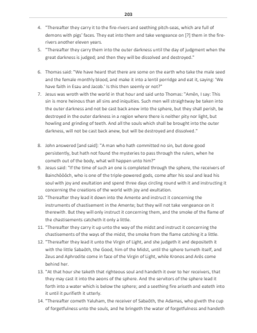 2034. \demons with pigs' faces. They eat into them and take vengeance on [?] them in the firerivers another eleven years.5. \great darkness is judged; and then they will be dissolved and destroyed.\6. Thomas said: \and the female monthly blood, and make it into a lentil porridge and eat it, saying: 'We have faith in Esau and Jacob.' Is this then seemly or not?\7. Jesus was wroth with the world in that hour and said unto Thomas: \sin is more heinous than all sins and iniquities. Such men will straightway be taken into the outer darkness and not be cast back anew into the sphere, but they shall perish, be destroyed in the outer darkness in a region where there is neither pity nor light, but howling and grinding of teeth. And all the souls which shall be brought into the outer darkness, will not be cast back anew, but will be destroyed and dissolved.\8. John answered [and said]: \persistently, but hath not found the mysteries to pass through the rulers, when he cometh out of the body, what will happen unto him?\9. Jesus said: \Bainch%u014d%u014d%u014dch, who is one of the triple-powered gods, come after his soul and lead his soul with joy and exultation and spend three days circling round with it and instructing it concerning the creations of the world with joy and exultation.10. \instruments of chastisement in the Amente; but they will not take vengeance on it therewith. But they will only instruct it concerning them, and the smoke of the flame of the chastisements catcheth it only a little.11. \chastisements of the ways of the midst, the smoke from the flame catching it a little.12. \with the little Saba%u014dth, the Good, him of the Midst, until the sphere turneth itself, and Zeus and Aphrodite come in face of the Virgin of Light, while Kronos and Ar%u0113s come behind her.13. \they may cast it into the aeons of the sphere. And the servitors of the sphere lead it forth into a water which is below the sphere; and a seething fire ariseth and eateth into it until it purifieth it utterly.14. \of forgetfulness unto the souls, and he bringeth the water of forgetfulness and handeth