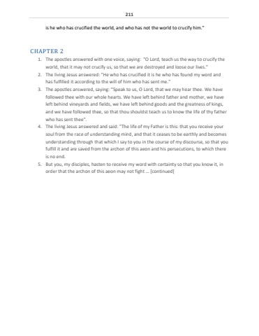 211is he who has crucified the world, and who has not the world to crucify him.\CHAPTER 21. The apostles answered with one voice, saying: \world, that it may not crucify us, so that we are destroyed and loose our lives.\2. The living Jesus answered: \has fulfilled it according to the will of him who has sent me.\3. The apostles answered, saying: %u201cSpeak to us, O Lord, that we may hear thee. We have followed thee with our whole hearts. We have left behind father and mother, we have left behind vineyards and fields, we have left behind goods and the greatness of kings, and we have followed thee, so that thou shouldst teach us to know the life of thy father who has sent thee\4. The living Jesus answered and said: \soul from the race of understanding mind, and that it ceases to be earthly and becomes understanding through that which I say to you in the course of my discourse, so that you fulfill it and are saved from the archon of this aeon and his persecutions, to which there is no end. 5. But you, my disciples, hasten to receive my word with certainty so that you know it, in order that the archon of this aeon may not fight %u2026 [continued]