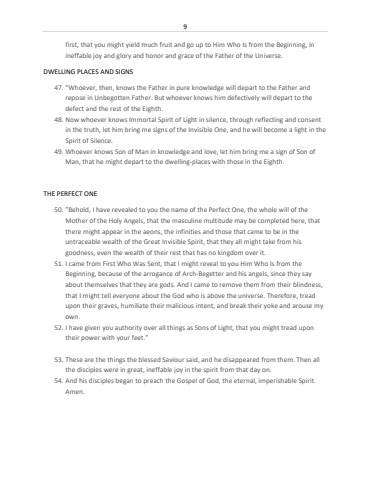 9first, that you might yield much fruit and go up to Him Who Is from the Beginning, in ineffable joy and glory and honor and grace of the Father of the Universe.DWELLING PLACES AND SIGNS47. \repose in Unbegotten Father. But whoever knows him defectively will depart to the defect and the rest of the Eighth. 48. Now whoever knows Immortal Spirit of Light in silence, through reflecting and consent in the truth, let him bring me signs of the Invisible One, and he will become a light in the Spirit of Silence. 49. Whoever knows Son of Man in knowledge and love, let him bring me a sign of Son of Man, that he might depart to the dwelling-places with those in the Eighth.THE PERFECT ONE50. \Mother of the Holy Angels, that the masculine multitude may be completed here, that there might appear in the aeons, the infinities and those that came to be in the untraceable wealth of the Great Invisible Spirit, that they all might take from his goodness, even the wealth of their rest that has no kingdom over it. 51. I came from First Who Was Sent, that I might reveal to you Him Who Is from the Beginning, because of the arrogance of Arch-Begetter and his angels, since they say about themselves that they are gods. And I came to remove them from their blindness, that I might tell everyone about the God who is above the universe. Therefore, tread upon their graves, humiliate their malicious intent, and break their yoke and arouse my own. 52. I have given you authority over all things as Sons of Light, that you might tread upon their power with your feet.\53. These are the things the blessed Saviour said, and he disappeared from them. Then all the disciples were in great, ineffable joy in the spirit from that day on.54. And his disciples began to preach the Gospel of God, the eternal, imperishable Spirit. Amen.