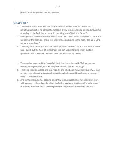 217powers (exousiai) and all the wicked ones. CHAPTER 41. They do not come from me. And furthermore he who (is born) in the flesh of unrighteousness has no part in the Kingdom of my Father, and also he who (knows) me according to the flesh has no hope (in the) Kingdom of God, the Father.\2. (The apostles) answered with one voice, they said: \we born of the flesh, and (have we) known thee according to the flesh? Tell us, O Lord, for we are troubled.\3. The living Jesus answered and said to his apostles: \(you) dwell, but the flesh of (ignorance) and non-understanding which exists in ignorance, which leads astray many from the (word) of my Father.\4. The apostles answered the (words) of the living Jesus, they said: %understanding happens, that we may beware of it, jest we should go ... \5. The living Jesus answered and said: \my garment, without understanding and (knowing) me, and blasphemes my name, I have . . . to destruction. 6. And furthermore, he has become an earthly son because he has not known my word with certainty %u2013 these (words) which the Father spoke, so that I myself should teach those who will know me at the completion of the pleroma of him who sent me.\