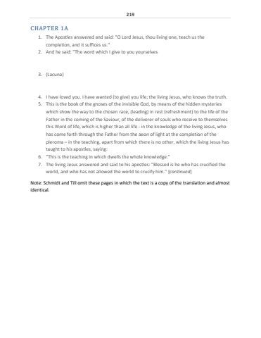 219CHAPTER 1A1. The Apostles answered and said: \completion, and it suffices us.\2. And he said: \3. (Lacuna)4. I have loved you. I have wanted (to give) you life; the living Jesus, who knows the truth.5. This is the book of the gnoses of the invisible God, by means of the hidden mysteries which show the way to the chosen race, (leading) in rest (refreshment) to the life of the Father in the coming of the Saviour, of the deliverer of souls who receive to themselves this Word of life, which is higher than all life - in the knowledge of the living Jesus, who has come forth through the Father from the aeon of light at the completion of the pleroma %u2013 in the teaching, apart from which there is no other, which the living Jesus has taught to his apostles, saying:6. \7. The living Jesus answered and said to his apostles: \world, and who has not allowed the world to crucify him.\Note: Schmidt and Till omit these pages in which the text is a copy of the translation and almost identical.