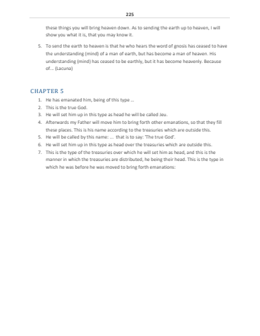 225these things you will bring heaven down. As to sending the earth up to heaven, I will show you what it is, that you may know it.5. To send the earth to heaven is that he who hears the word of gnosis has ceased to have the understanding (mind) of a man of earth, but has become a man of heaven. His understanding (mind) has ceased to be earthly, but it has become heavenly. Because of... (Lacuna)CHAPTER 51. He has emanated him, being of this type %u2026 2. This is the true God. 3. He will set him up in this type as head he will be called Jeu. 4. Afterwards my Father will move him to bring forth other emanations, so that they fill these places. This is his name according to the treasuries which are outside this. 5. He will be called by this name: ... that is to say: 'The true God'. 6. He will set him up in this type as head over the treasuries which are outside this. 7. This is the type of the treasuries over which he will set him as head, and this is the manner in which the treasuries are distributed, he being their head. This is the type in which he was before he was moved to bring forth emanations: