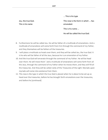 227Jeu, the true God.This is his name%u2026 This is his typeThis now is the form in which %u2026 has emanated.This is his name %u2026He will be called the true God.8. Furthermore he will be called Jeu. He will be father of a multitude of emanations. And a multitude of emanations will come forth from him through the command of my Father, and they themselves will be fathers of the treasuries.9. I will place a multitude as heads over them, and they will be called Jeu, the true God. It is he who will be father of all the Jeus, because he is an emanation of my Father. 10. And the true God will emanate through the command of my Father. He will be head over them. He will move them ' and a multitude of emanations will come forth from all the Jeus, through the command of my Father when he moves them, and they will fill all the treasuries. And they will be called ranks of the Treasuries of the Light. Myriads upon myriads will come into existence from them. 11. This now is the type in which the true God is placed when he is about to be set up as head over the treasuries, before he has brought forth emanations over the treasuries, and before he [continued]