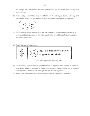 229has brought forth emanations, because my Father has not yet moved him to bring forth and to set up. 12. This is his type which I have already set forth, but this is his type when he will bring forth emanations. This is the type of the true God in the manner in which he is placed:%u202613. The three lines which are thus, they are the voices which he will give out when he is commanded to sing praises to the Father, so that he himself brings forth emanations, and he also emanates. 14. This is the type of what he is: This is his type when he brings forth.15. This moreover is the manner in which the true God is placed as he is about to emanate emanations, when he is moved by my Father to bring forth emanations, and to set them up as head over the treasuries, through the command of my Father. 16. A multitude come forth from them and they fill all the treasuries [continued]