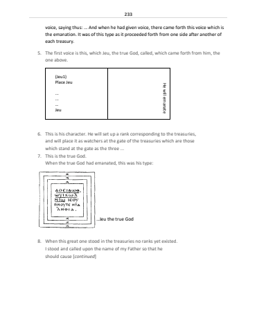 233voice, saying thus: ... And when he had given voice, there came forth this voice which is the emanation. It was of this type as it proceeded forth from one side after another of each treasury. 5. The first voice is this, which Jeu, the true God, called, which came forth from him, the one above.(Jeu1) Place Jeu... ... %u2026JeuHe will emanate6. This is his character. He will set up a rank corresponding to the treasuries,and will place it as watchers at the gate of the treasuries which are thosewhich stand at the gate as the three ... 7. This is the true God.When the true God had emanated, this was his type:...Jeu the true God8. When this great one stood in the treasuries no ranks yet existed.I stood and called upon the name of my Father so that heshould cause [continued]