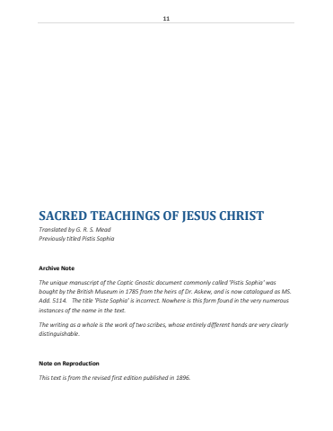 11SACRED TEACHINGS OF JESUS CHRISTTranslated by G. R. S. MeadPreviously titled Pistis SophiaArchive NoteThe unique manuscript of the Coptic Gnostic document commonly called 'Pistis Sophia' was bought by the British Museum in 1785 from the heirs of Dr. Askew, and is now catalogued as MS. Add. 5114. The title 'Piste Sophia' is incorrect. Nowhere is this form found in the very numerous instances of the name in the text.The writing as a whole is the work of two scribes, whose entirely different hands are very clearly distinguishable.Note on ReproductionThis text is from the revised first edition published in 1896.