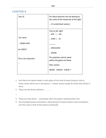 239CHAPTER 8(Jeu 3) For these watchers do not belong to the ranks of the treasuries of the light%u2026 [ 9 underlined names ]His name... NZWA IWYIJeu (IEOY) This is his character:...Text on far right%u2026 AW | %u2026 OA %u2026 ZAW | %u2026 IA______%u2026 EWCACZW%u2026 EZAWIThe watchers which standwithin the gates are these.their names:IWZAA ZHAZAI CHEZA ?1. And there are twelve heads in each place of the rank of every treasury; that is,these names which are in the places [ %u2013 ] these names except for those that will be in them.2. These are the three watchers: %u2026 %u2026 %u2026%u20263. These are they which ... emanated, when the power radiated within him.4. He emanated twelve emanations, these being his twelve heads in each emanation,and this name is that of the twelve [continued]